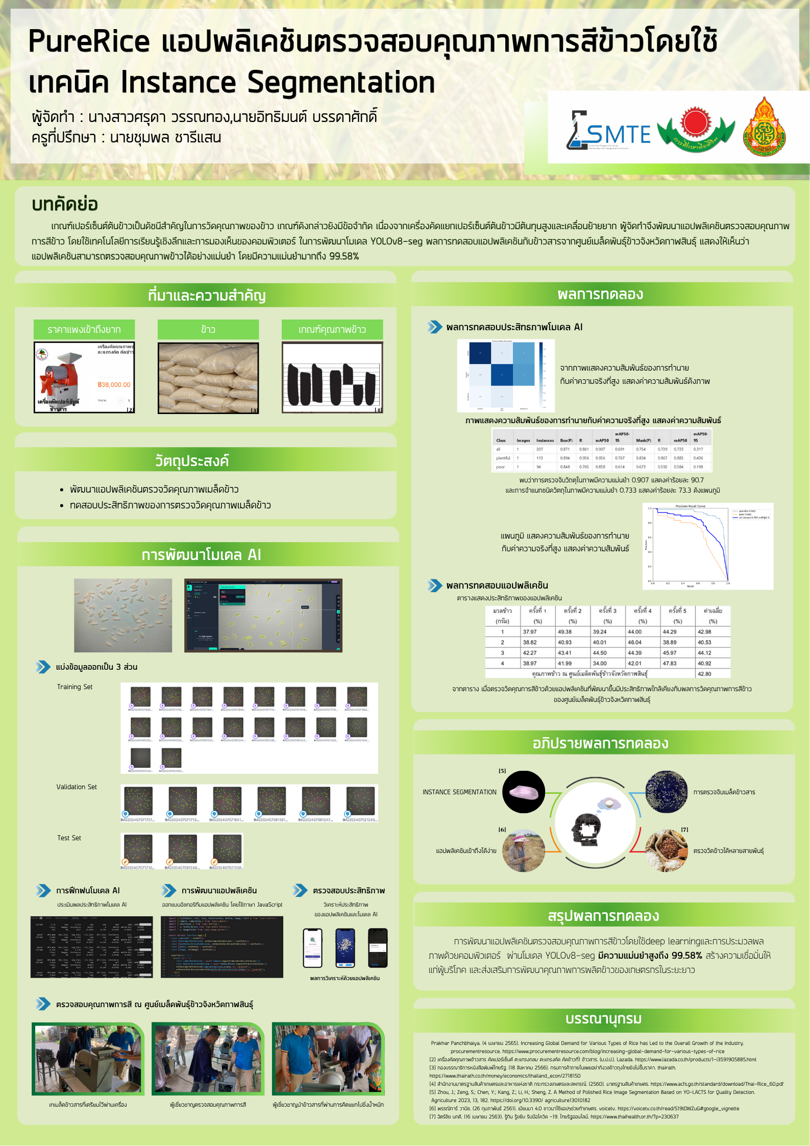 Evaluation Page จำนวนผลงาน 9ลำดับชื่อผลงานโรงเรียนFile Upload PDF รายงานผลงานสิ่งประดิษฐ์File Upload Powerpoint /Canva – PDFอัพโหลดวิดีโอ ภาษาไทย (ไม่เกิน 300 MB)อัพโหลดวิดีโอ ภาษาอังกฤษ (ไม่เกิน 300 MB)ไฟล์ Poster นำเสนอผลงาน ภาษาไทย (ขนาดสั่งพิมพ์ size A0) ไฟล์ Poster นำเสนอผลงาน ภาษาอังกฤษ (ขนาดสั่งพิมพ์ size A0) 1เครื่องช่วยฟักไข่ตั๊กเเตนกาฬสินธุ์พิทยาสรรพ์ 2PureRice แอปพลิเคชันตรวจสอบคุณภาพการสีข้าวโดยใช้เทคนิค Instance Segmentationกาฬสินธุ์พิทยาสรรพ์ 3ต้นแบบเครื่องคัดแยกดอกเกลือด้วย AI (The Prototype of AI-Powered Rock Salt Crystal Classifier)บ่อเกลือ 4สายวัดตรวจสุขภาพสุกรป่าพะยอมพิทยาคม 5เครื่องดักจับแมลงแล้วเปลี่ยนแปลงให้กลายเป็นปุ๋ยพนมสารคาม (พนมอดุลวิทยา) 6เครื่องวัดความสุกของทุเรียนระบบอัตโนมัติด้วยเซนเซอร์วัดอุณหภูมิเชิงตัวเลขโรงเรียนลำทับประชานุเคราะห์ 7Smart MyceLitter : ทรายแมวไมซีเลียมอัจฉริยะเวียงเชียงรุ้งวิทยาคม 8ระบบปัญญาประดิษฐ์สำหรับการนับจำนวนสัตว์ในฟาร์มสตูลวิทยา 9การศึกษาประสิทธิภาพการดูดซับน้ำและดูดกลิ่นปัสสาวะแมวของทรายแมวจากผักตบชวาผสมกาบมะพร้าวหัวหิน There are no views with that ID